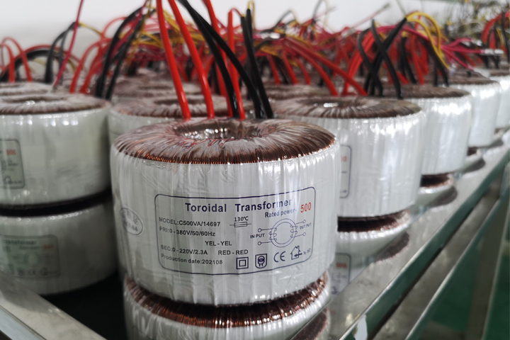圣元電器公司的環(huán)形變壓器成品整齊排列放置架臺上。